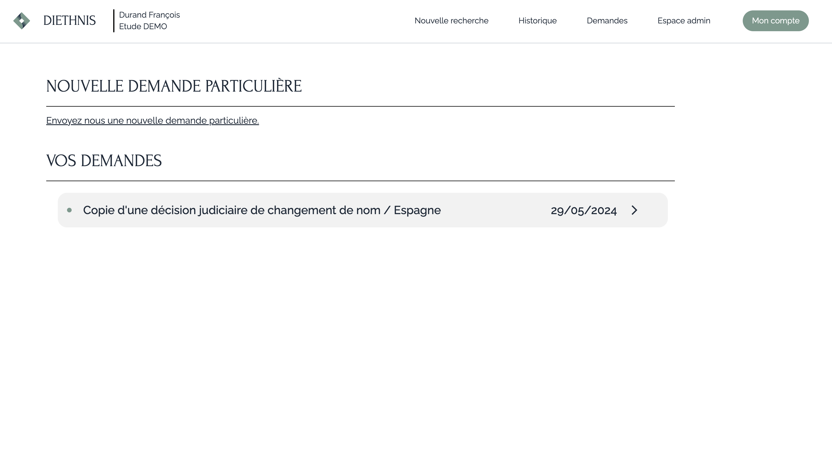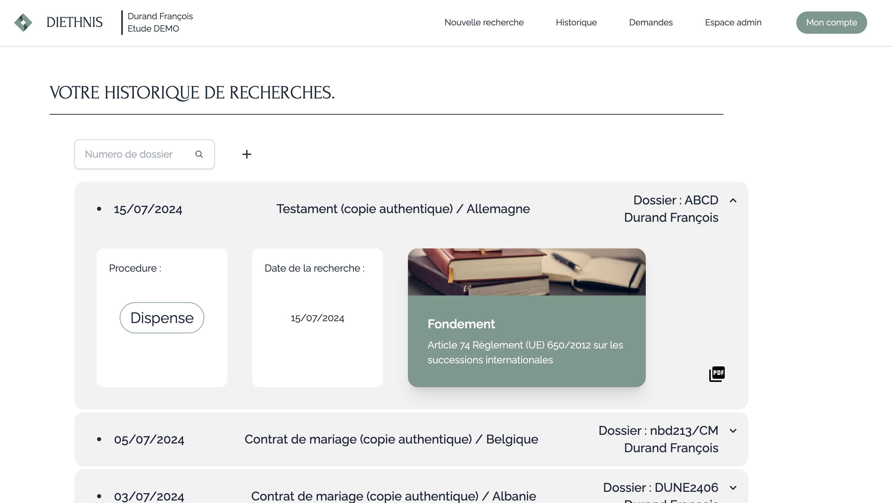 Il est possible d’historiser le résultat, qu'il s'agisse d'une recherche standard ou demande particulière, en lui attachant une référence de dossier client.